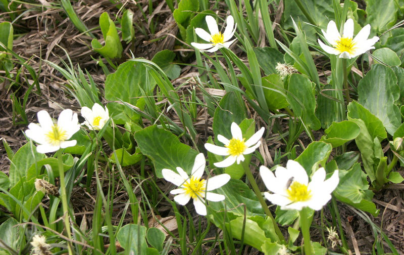 White blossoming Meadow Bright, also known as Elkslip or Marsh Marigold, is a North American cousin to the yellow-blossoming Caltha palustris, which is also called Marsh Marigold. Neither is a true Marigold. That name derives from church festivals in the Middle Ages designating Caltha palustris as one of the flowers devoted to the Virgin Mary.